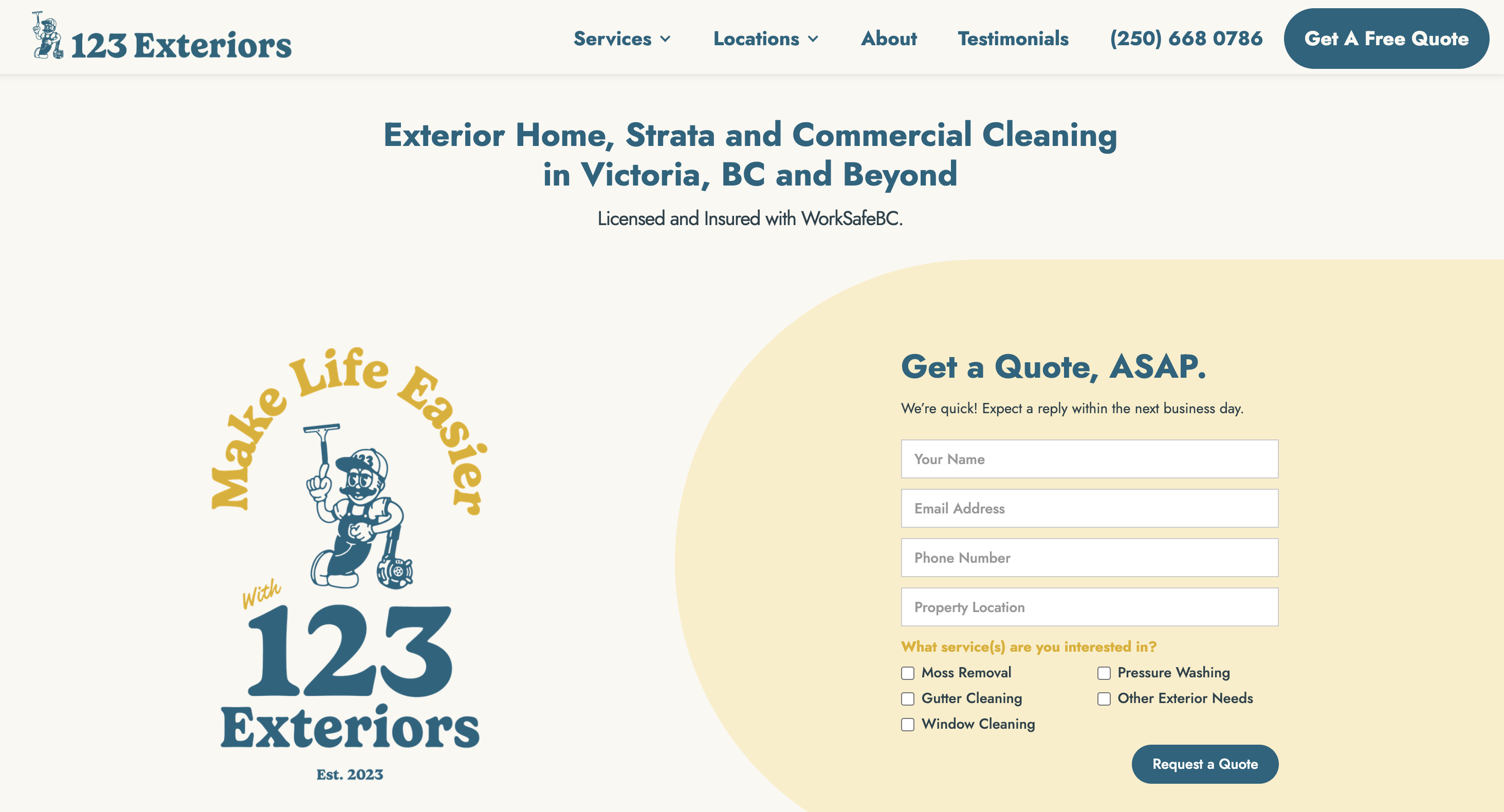As a new local business, 123 Exteriors needed a complete brand identity from the ground up. Together, we designed a supercool logo, a well-performing website to generate leads and branded materials including business cards, uniforms, truck decals and more. Today, their recognizable brand stands out in the community and continues to support their growth!