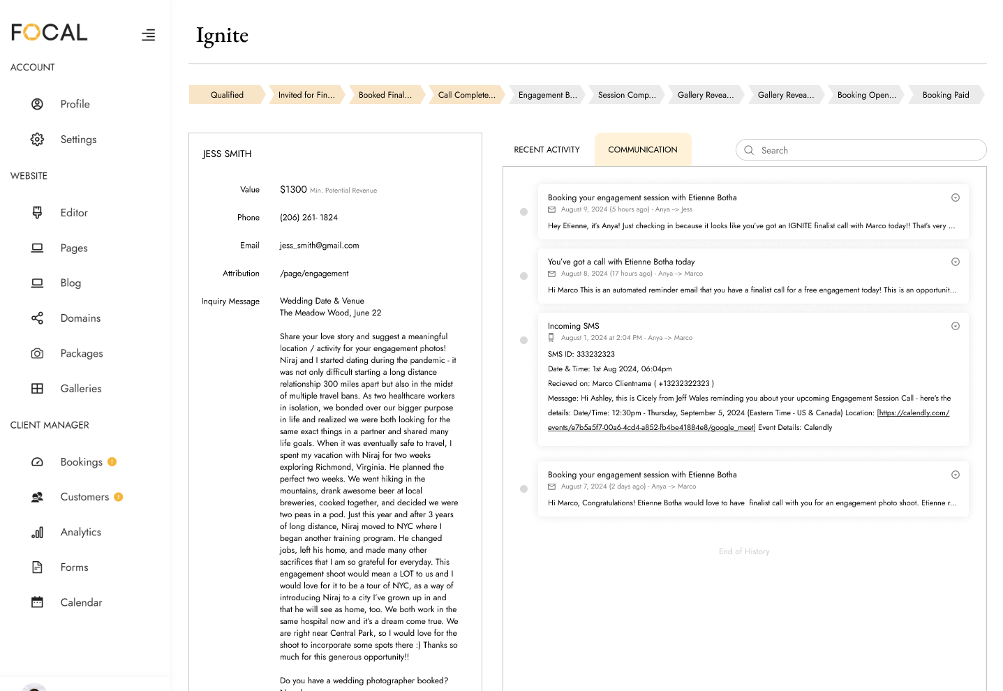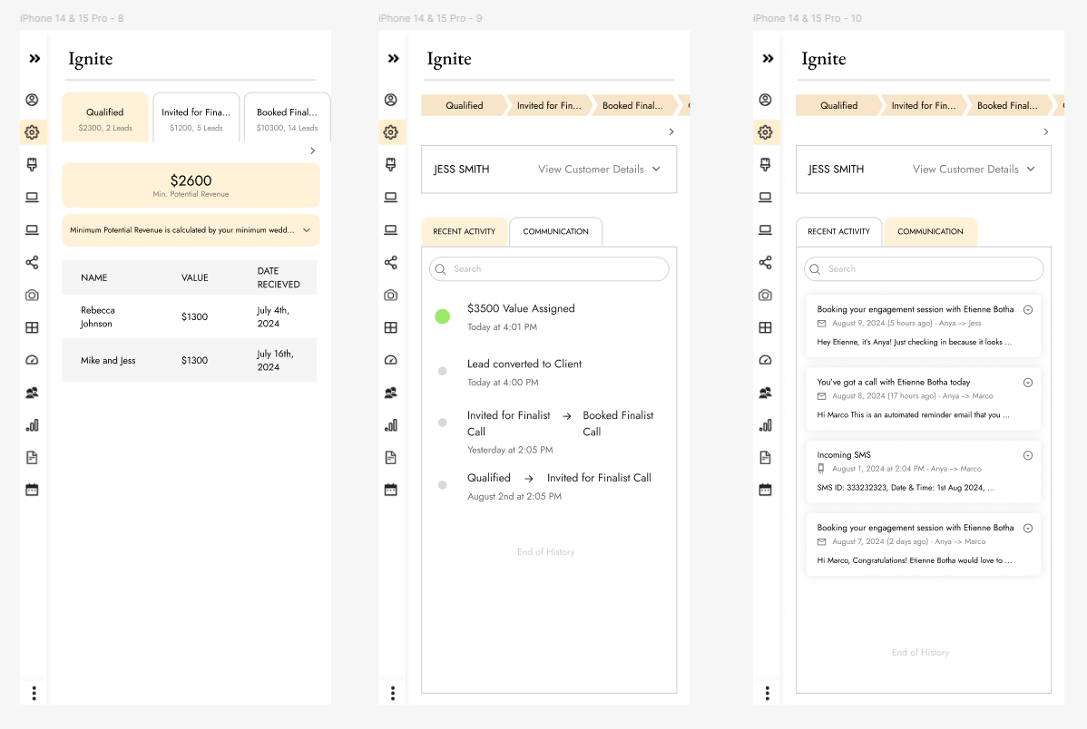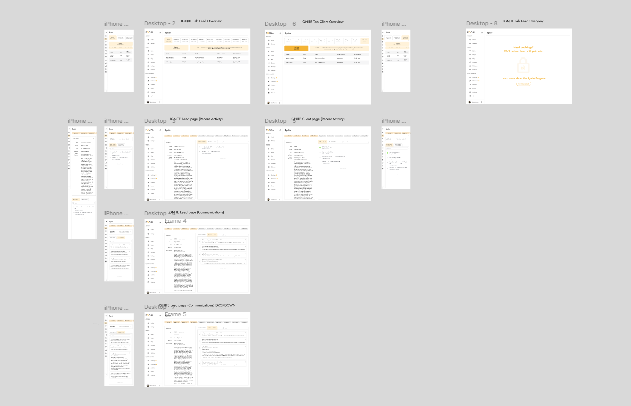 This project focuses on the UX/UI flow for the Ignite Program user dashboard. The main challenge was giving photographers clear visibility into their lead funnel, which was being managed by the Focal team during the program. I created a dashboard experience that was intuitive and transparent, allowing photographers to easily track their leads, understand their progress, and feel more connected to the process. This not only improved usability and strengthened trust between photographers and the Focal team, but also significantly reduced user complaints during the program (phew).